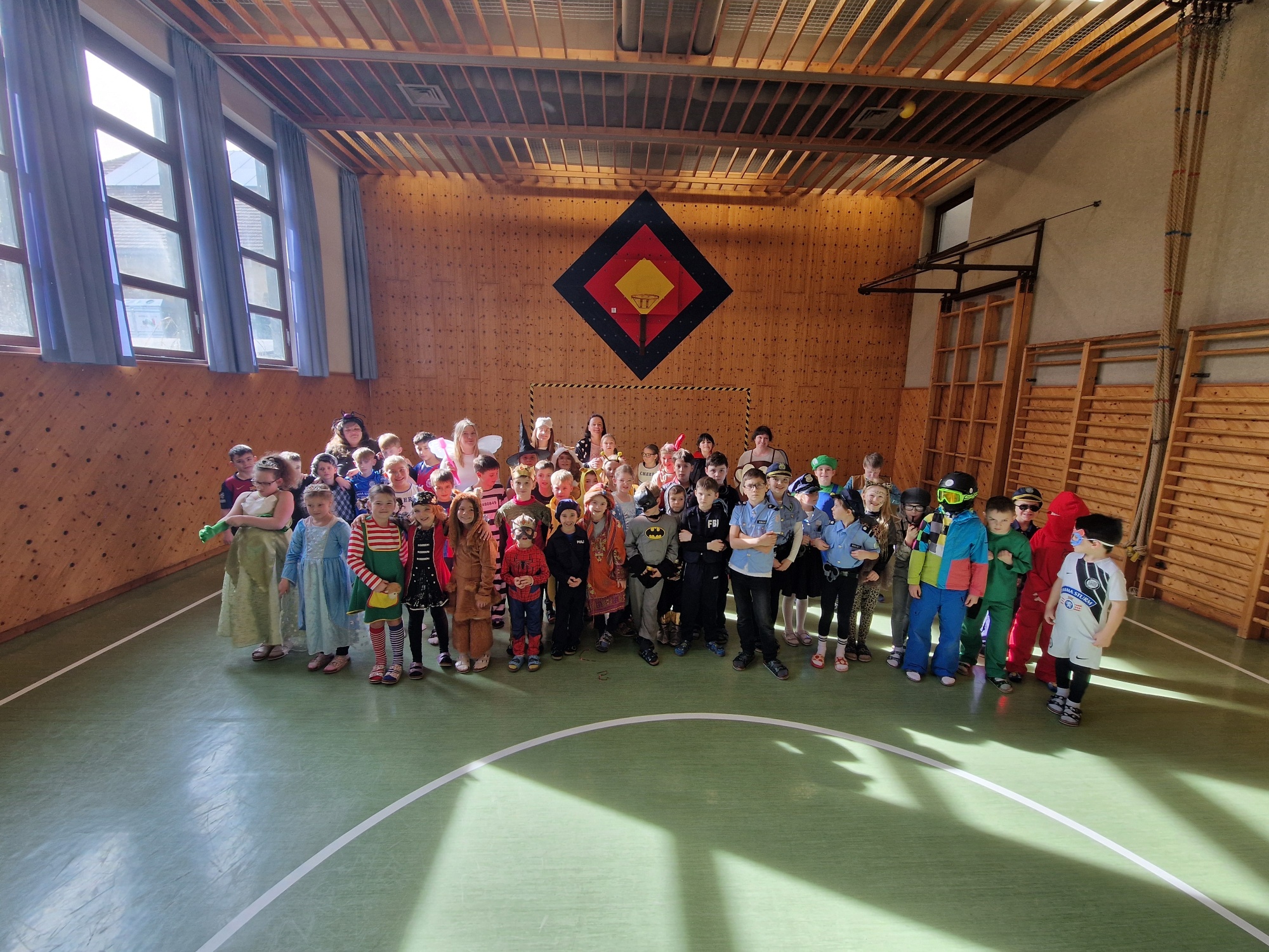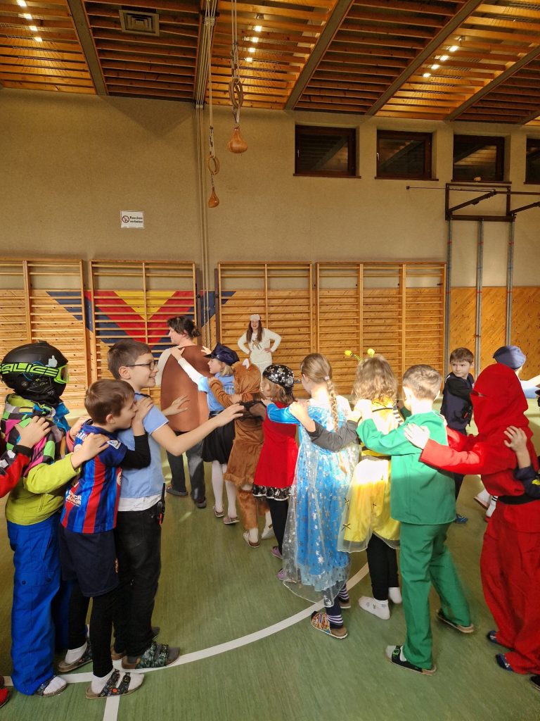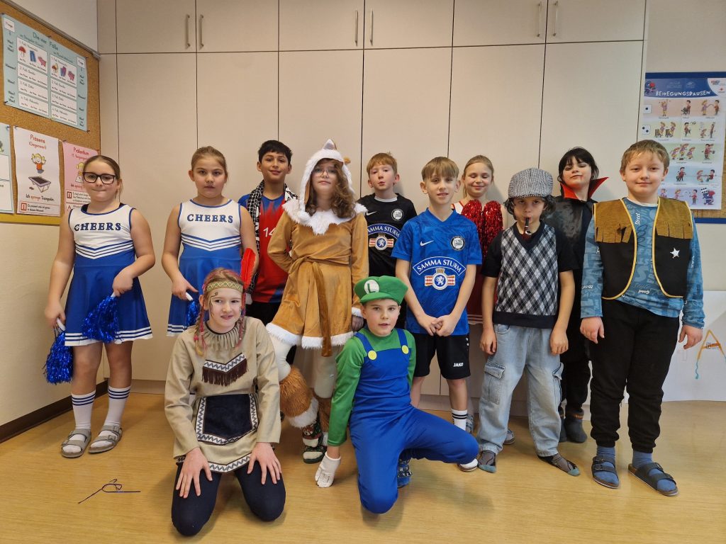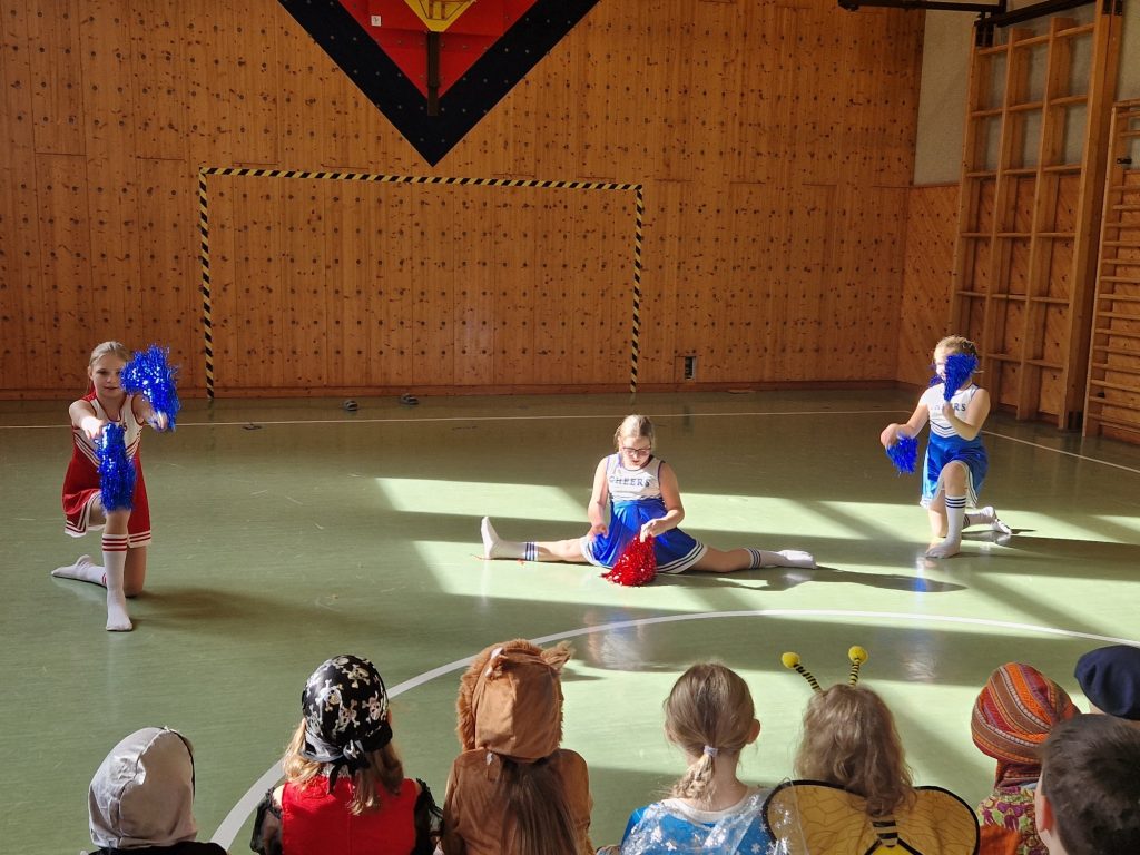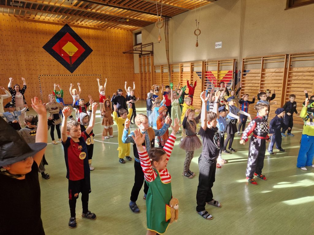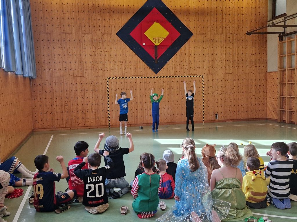 Der Fasching wurde bei uns an einem Donnerstag gefeiert. Nach einer Stärkung durch Krapfen wirbelten alle Kinder bunt verkleidet in den Turnsaal. Dort gab es Darbietungen von Tanzgruppen der 4. Stufe. Eine Mädchen-und eine Bubengruppe zeigten ihre in der Schule geprobten Tänze. Besser geht es nicht! Die Begeisterung der Zuschauerinnen und Zuschauer war groß. Beim Vogerltanz, Macarena, Gute-Laune-Song und der Polonaise waren alle mit Freude dabei.