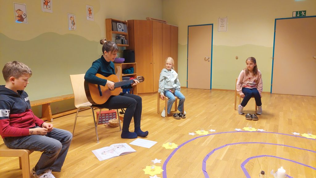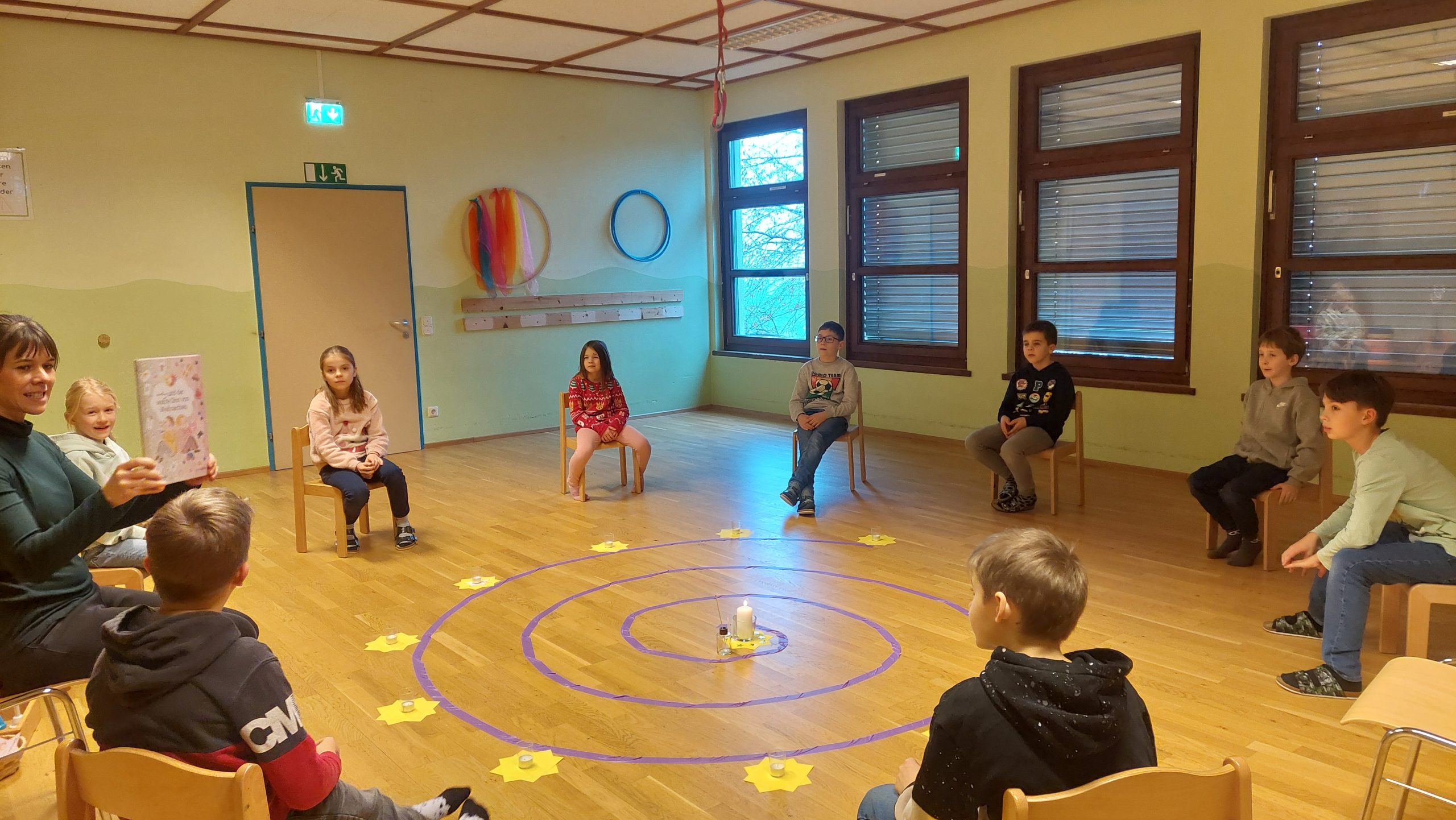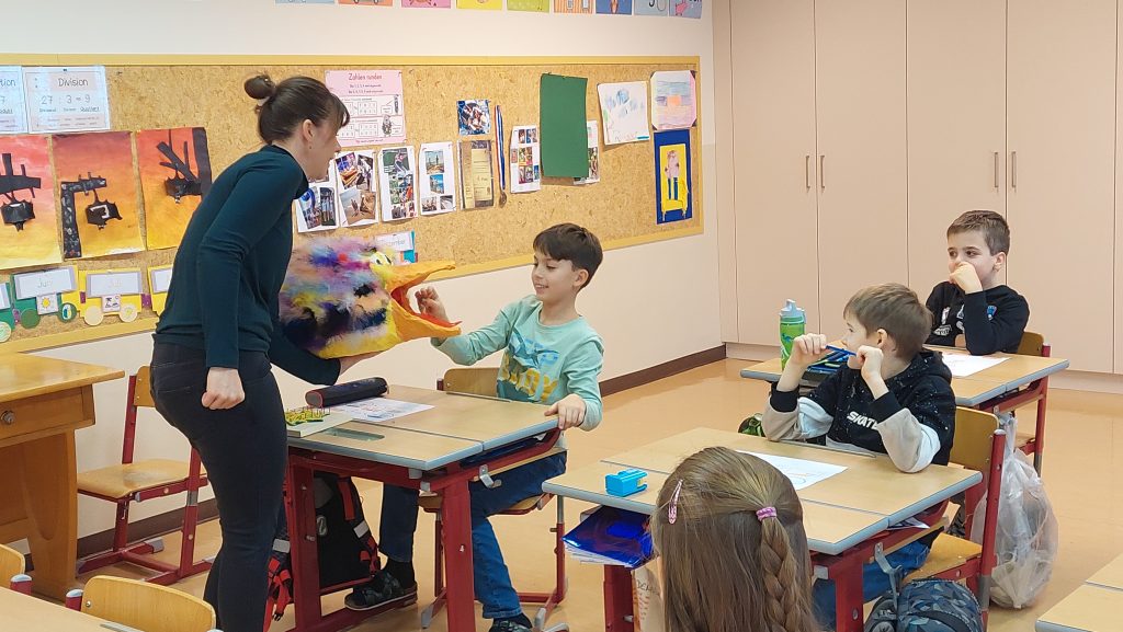 Frau Storm stellte der 3.Schulstufe in zwei Stunden ihren Beruf Evolutionspädagogin vor. Sie zeigte dazu den Kindern auf spielerische Weise die Evolutionsstufen vom Fisch bis zum Menschen und machte passende Übungen dazu. Im ehemaligen Kindergarten wurde dann gesungen, eine Geschichte vorgelesen und eine meditative Übung durchgeführt.