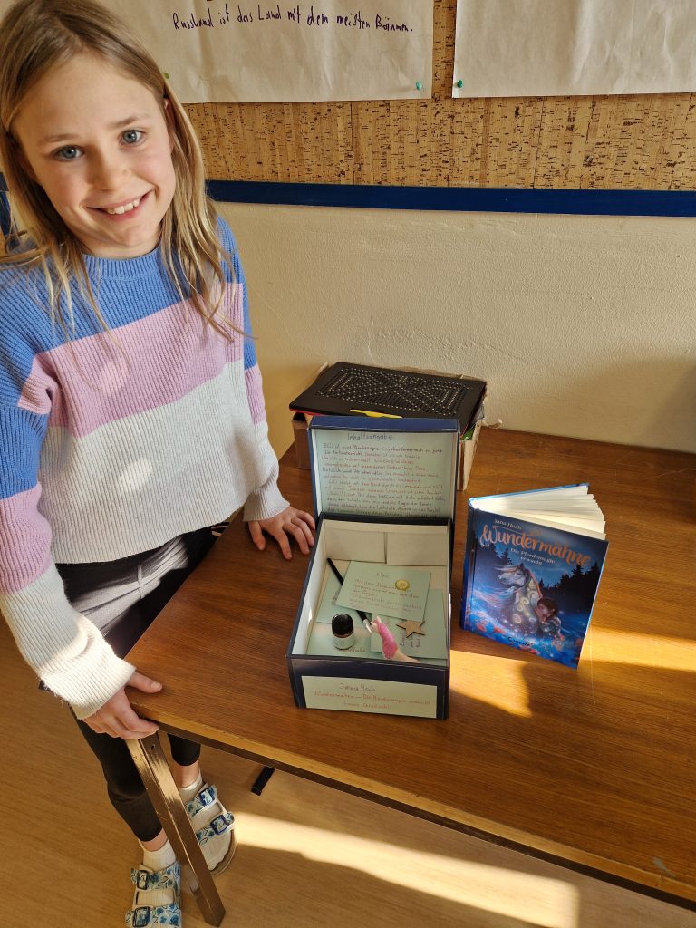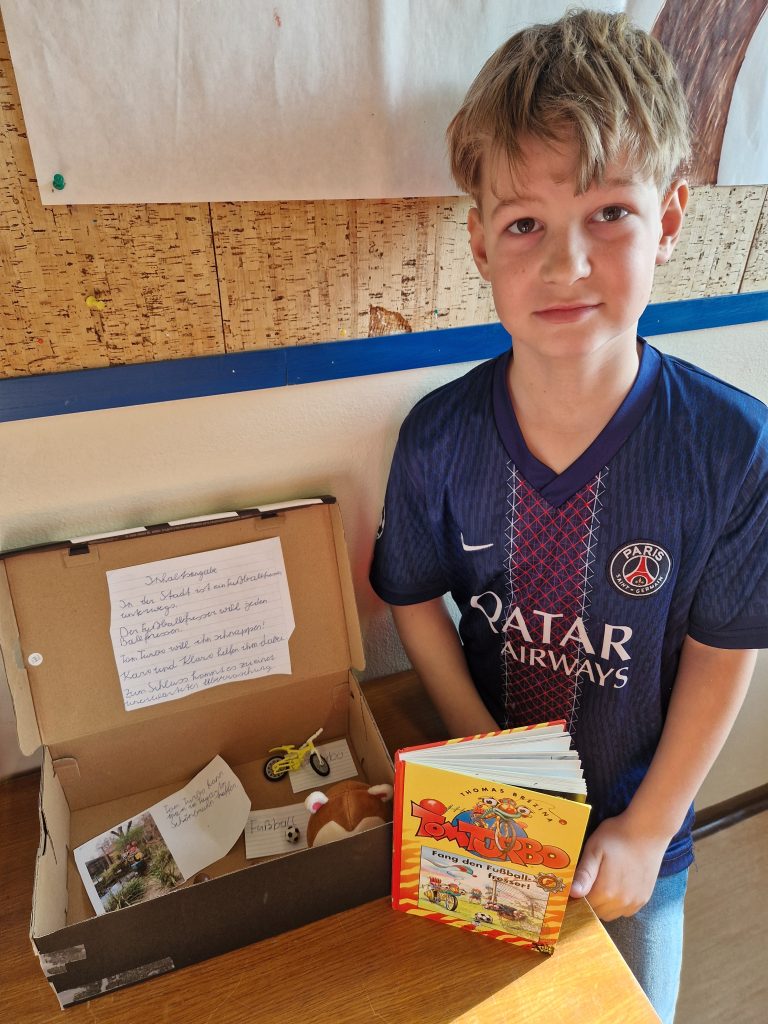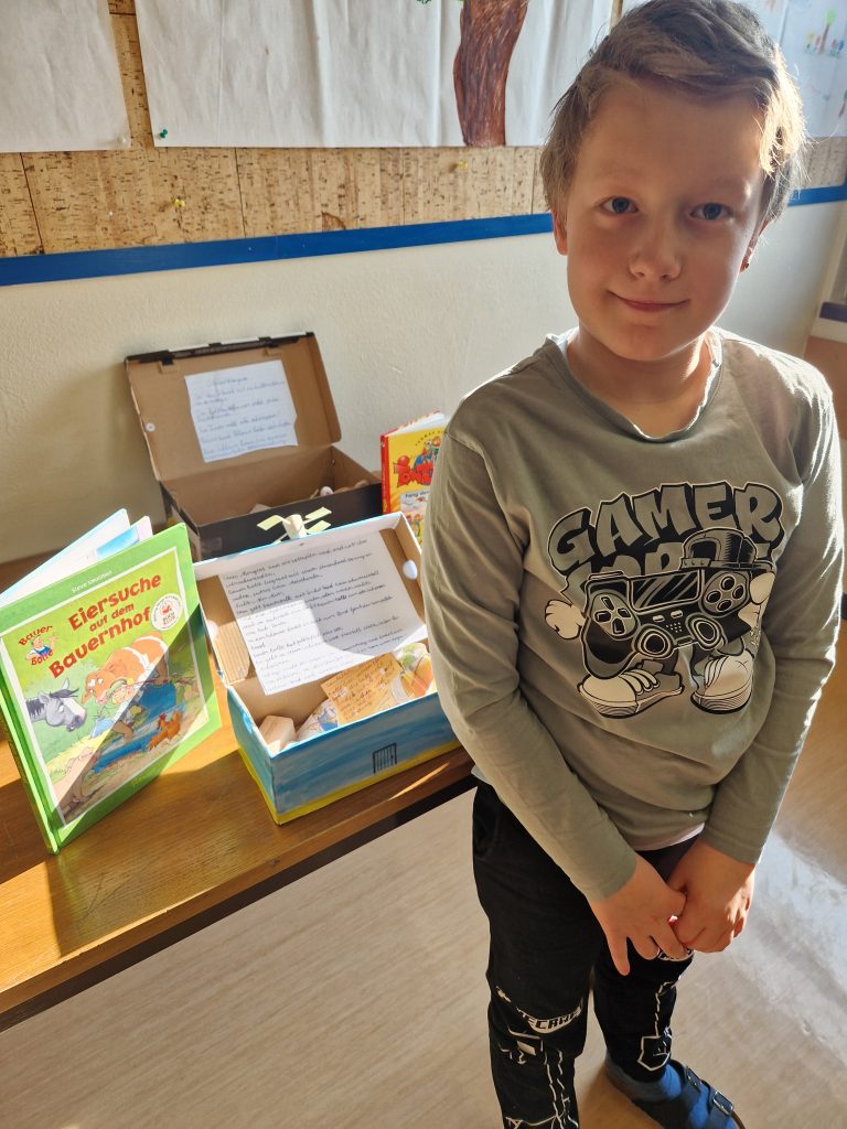 Die 4. Klasse gestaltet seit neuem Lesekisten. Zuerst sucht man sich ein Buch aus, das dem Alter entspricht. Danach nimmt man einen Schuhkarton oder eine Schachtel. Die gestaltet man dann sehr schön. In die Schachtel kommen dann kleine Sachen hinein, die zum Buch passen. Man klebt dann auch noch eine kleine Inhaltsangabe hinein. Und fertig ist deine Lesekiste. Die Lesekiste wird dann an einem Donnerstag vorgestellt. Es macht Spaß neue Bücher und Lesekisten zu entdecken.